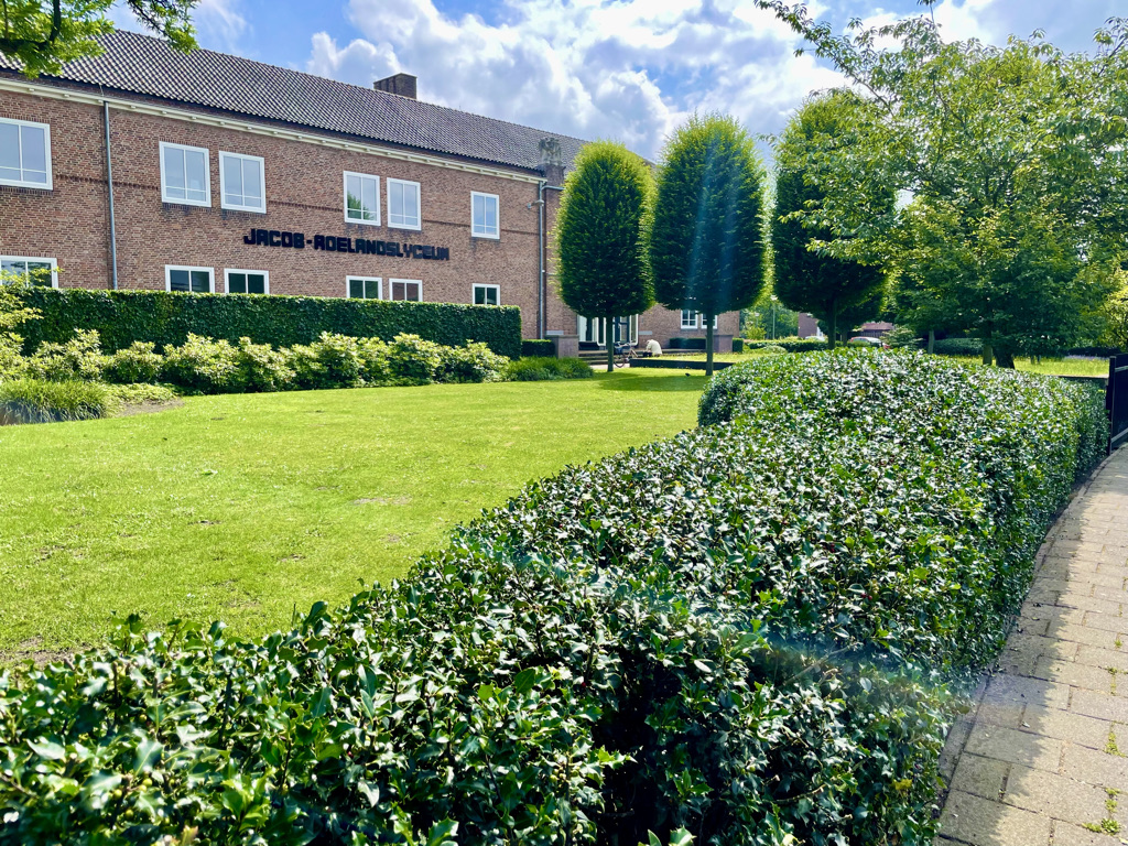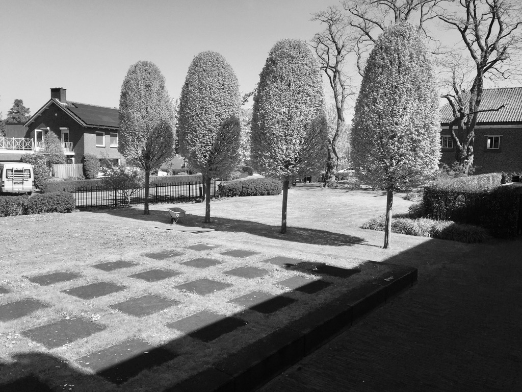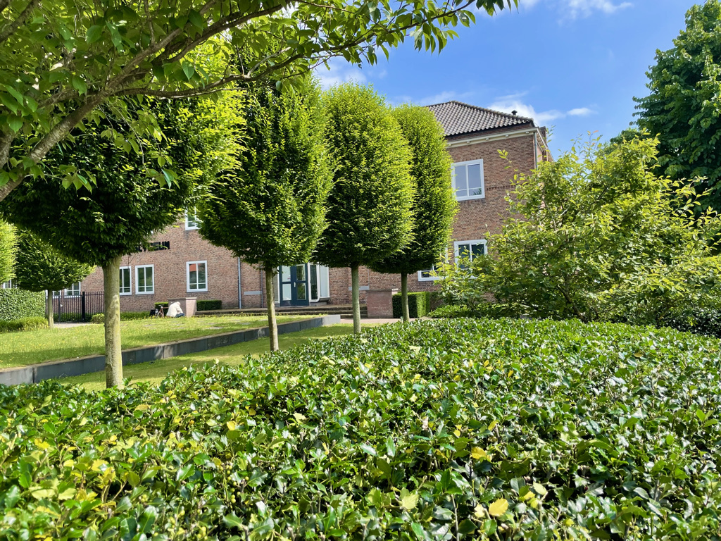 Het omliggende natuurgebied Dommeldal / de Beemd sluit naadloos aan op de formeel aangelegde tuin, die is gekenmerkt door de strakke vormen. Tevens vormen de antracietkleurige betonnen blokken een overgang in de hoogteverschillen van de tuin. Deze tuin heeft door alle jaargetijden heen een groene uitstraling.